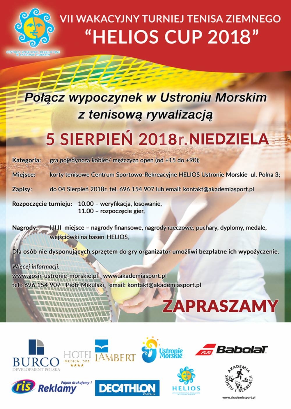 Zapisy przyjmowane są do dnia 04 Sierpnia 2017r. do godz. 20.00. Przy wpisywaniu na listę decyduje kolejność zgłoszeń telefonicznych i emailowych (data i godzina zgłoszenia). Każde zgłoszenie telefoniczne chętnego zawodnika musi być potwierdzone informacją SMS na nr tel. 696154907 lub zgłoszeniem emailowym na adres: kontakt@akademiasport.pl