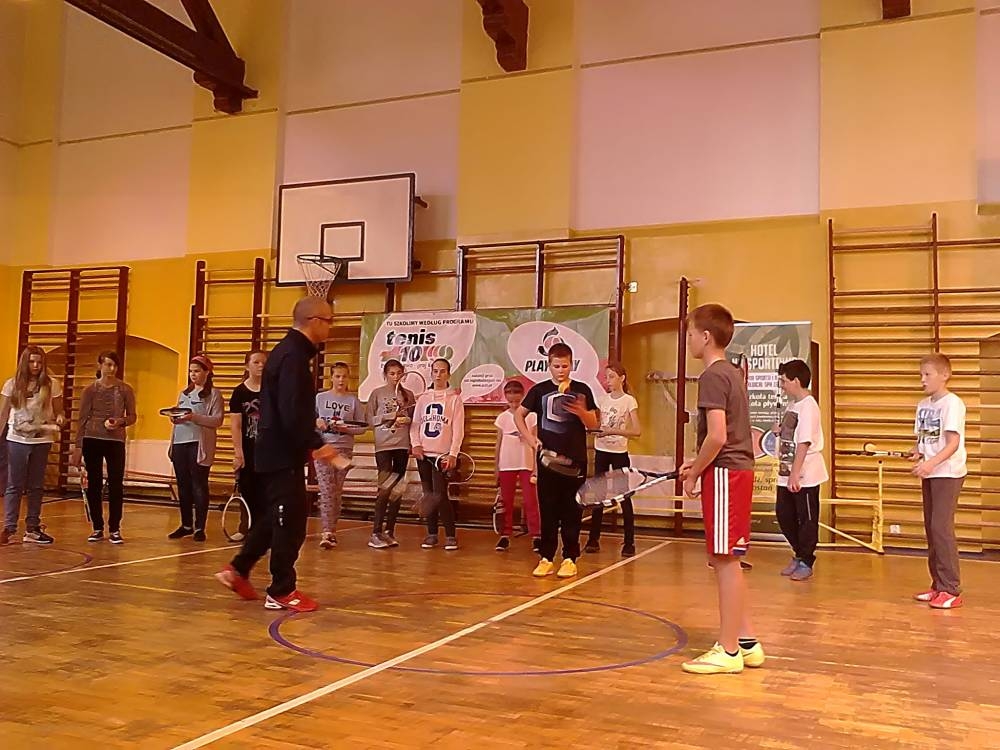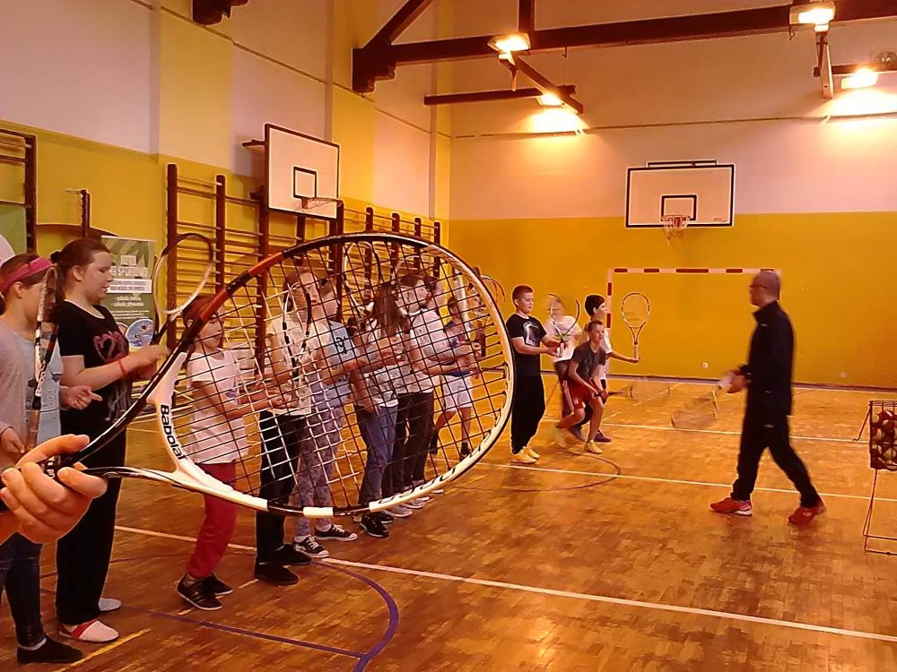 Zajęcia odbywały się w godzinach 8.00 do 15.30 i miały charakter zajęć pokazowych. Wiek dzieci biorących udział w zajęciach był różny i zawierał się w przedziale od 2 do 6 klasy szkoły podstawowej. I im młodsze klasy tym wydaje się było większe zainteresowanie zajęciami i zaangażowaniem w trakcie ich trwania. Zajęcia przeprowadziliśmy na sali gimnastycznej i pomimo niedużych jej rozmiarów udało się je przeprowadzić w sposób atrakcyjny i urozmaicony dla dzieci. To tylko dowodzi uniwersalności zajęć tenisowych dla najmłodszych.