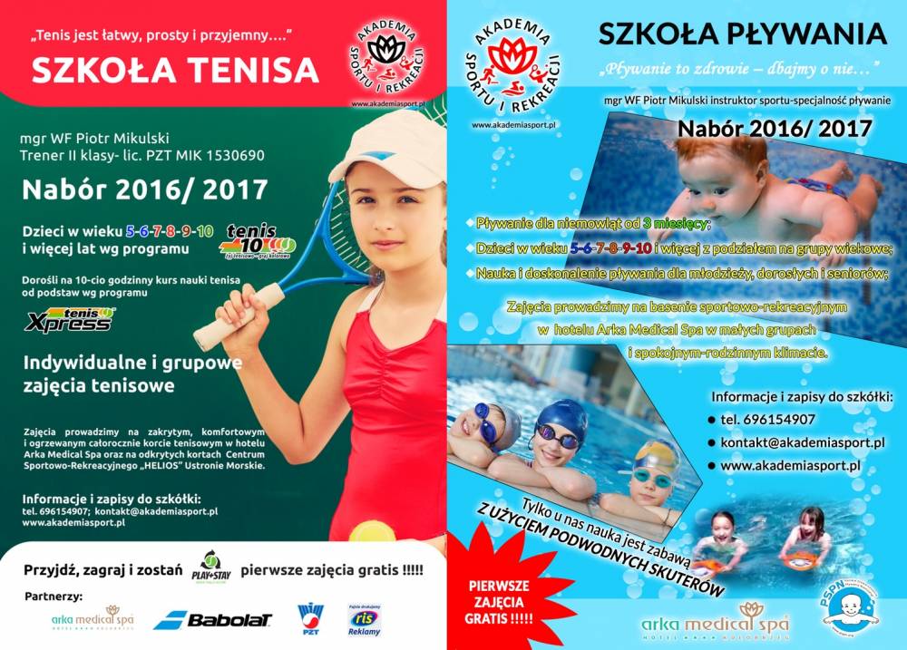 Akademia Sportu i Rekreacji Piotr Mikulski ogłasza nabór do szkółki tenisowej i pływacki na rok szkolny 2016/ 2017.
